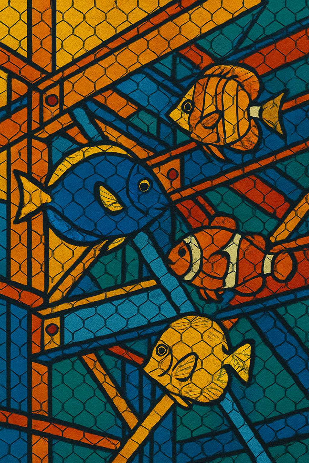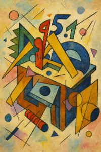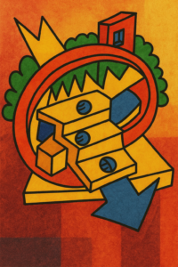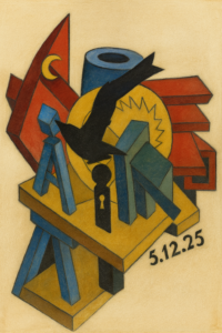 Durch anklicken vergrößern............................ und Beschreibung Die Arbeit zeigt eine kubistisch-konstruktive Komposition aus geometrischen Körpern, technischen Fragmenten und einem zentralen symbolischen Motiv. Auf einer gestuften, tischartigen Konstruktion stehen kantige Balken, prismatische Formen und zylinderartige Elemente, die an Bauteile einer Maschine oder eines abstrakten Apparates erinnern. Die Farbpalette ist klar und reduziert: Ocker- und Gelbtöne bilden die Basis, kontrastiert von Blau, Ziegelrot und tiefem Schwarz.